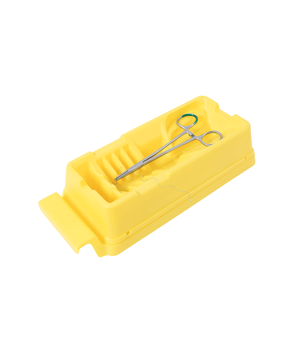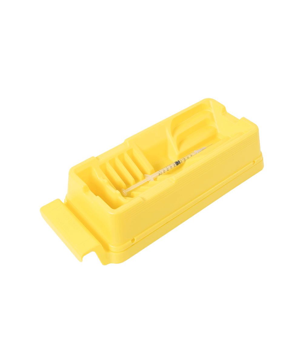 Designed to reduced the incidence of sharps injuries from hand-passing of sharps in operating theatres. Combines the Bladesafe transfer tray with a multi-functional ‘base tray’ – the Counting Tray. The Counting Tray features a counting area for suture needles with numbered foam strips, three scalpel removers, a magnetic pad for safely holding scalpels and two scalpel trenches. At the end of a procedure, the Bladesafe can be clipped onto the counting tray, housing any sharps, and safely disposed of as one.
