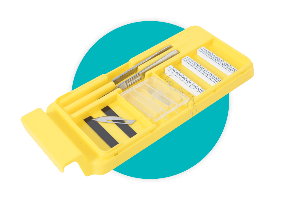 A double-sided adhesive strip on the underside of the tray allows the unit to be firmly affixed to surfaces, providing a neutral zone for the placement and retrieval of sharps during procedure. Once the procedure is complete, the Bladesafe Passing Tray clips snugly on top of the Counting Tray, providing safe containment and consolidated disposal of used sutures, blades and hyperdermic needles.