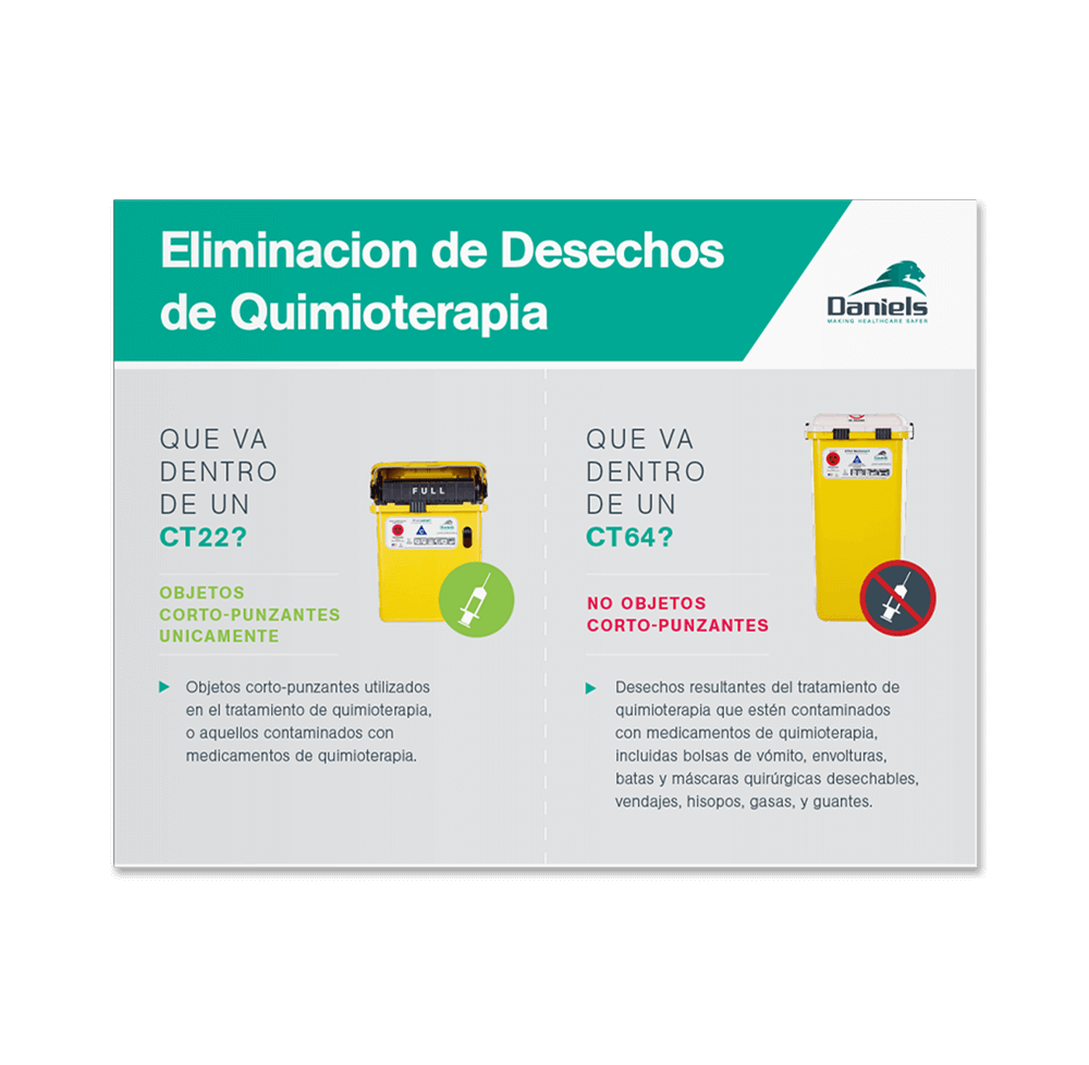 Los contenedores de Daniels CT22 y CT64 son perfectos para áreas de oncología. Este poster claramente define el uso perfecto de cada contenedor de quimioterapia.