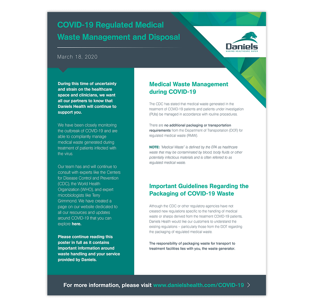 As the industry leader in clinically-designed waste management Daniels provides expert solutions in line with CDC requirements for the disposal, collection and treatment of COVID-19 waste, bulk vaccines and COVID-19 contaminated sharps.
