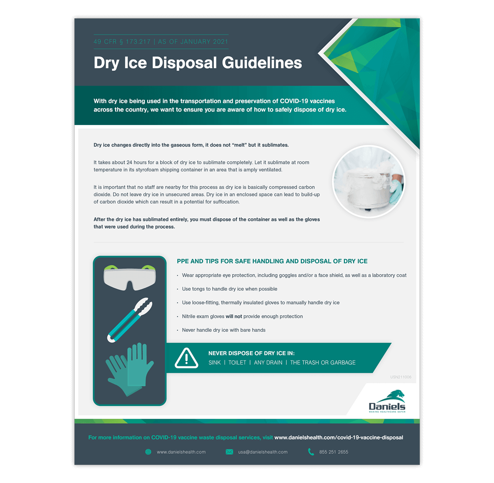 This guide will educate your staff on safe disposal of dry ice – a must if your facility is supporting healthcare with COVID-19 vaccinations. This flyer details the appropriate disposal process for dry ice, including what PPE to wear.