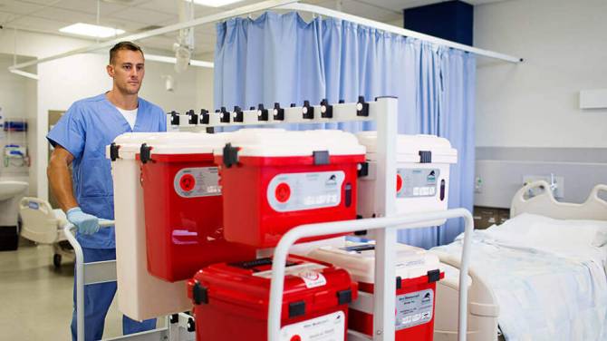 All good adventures begin with a map. Our team works with you to completely map the movement of waste throughout your facility – from generation to final waste pickup. From there, we identify how to ease that movement. We achieve this through our transporters that have been designed to deliver not only compact dust-free multi-stackable storage of sharps and medical waste containers but also to reduce manual labor in seamless container movement continuity between clinical areas and offsite transportation. Designed with mobility in mind, Daniels Transporters can be positioned for optimum access and utilized for the storage of both clean containers (eliminating space burden on utility rooms), and full containers staged for transport.