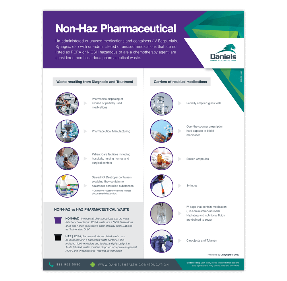 Illustrated guide that defines pharmaceutical waste and advises on disposal.