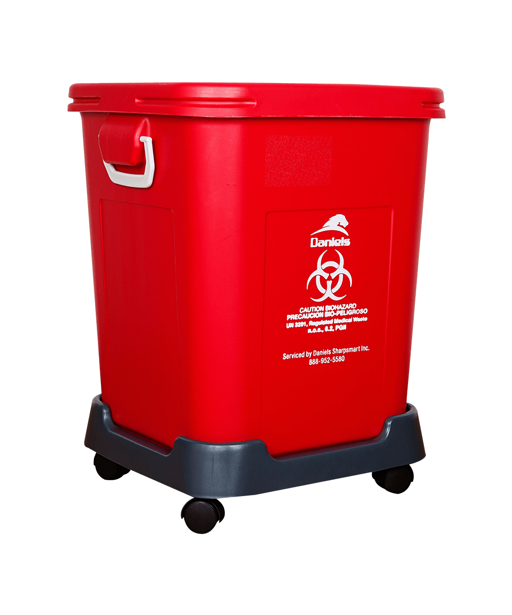 Designed for medium volume RMW waste disposal. Stackable, nestable, and mobile when paired with four wheel dolly