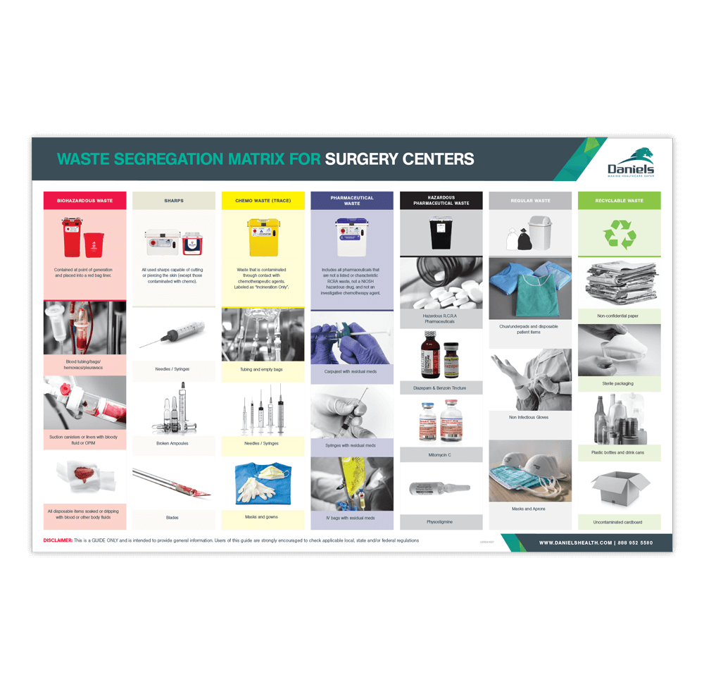 This waste matrix outlines correct containers and contents for disposal of all waste streams in a surgery center. To learn more about how the Daniels container system can help your facility, click here.